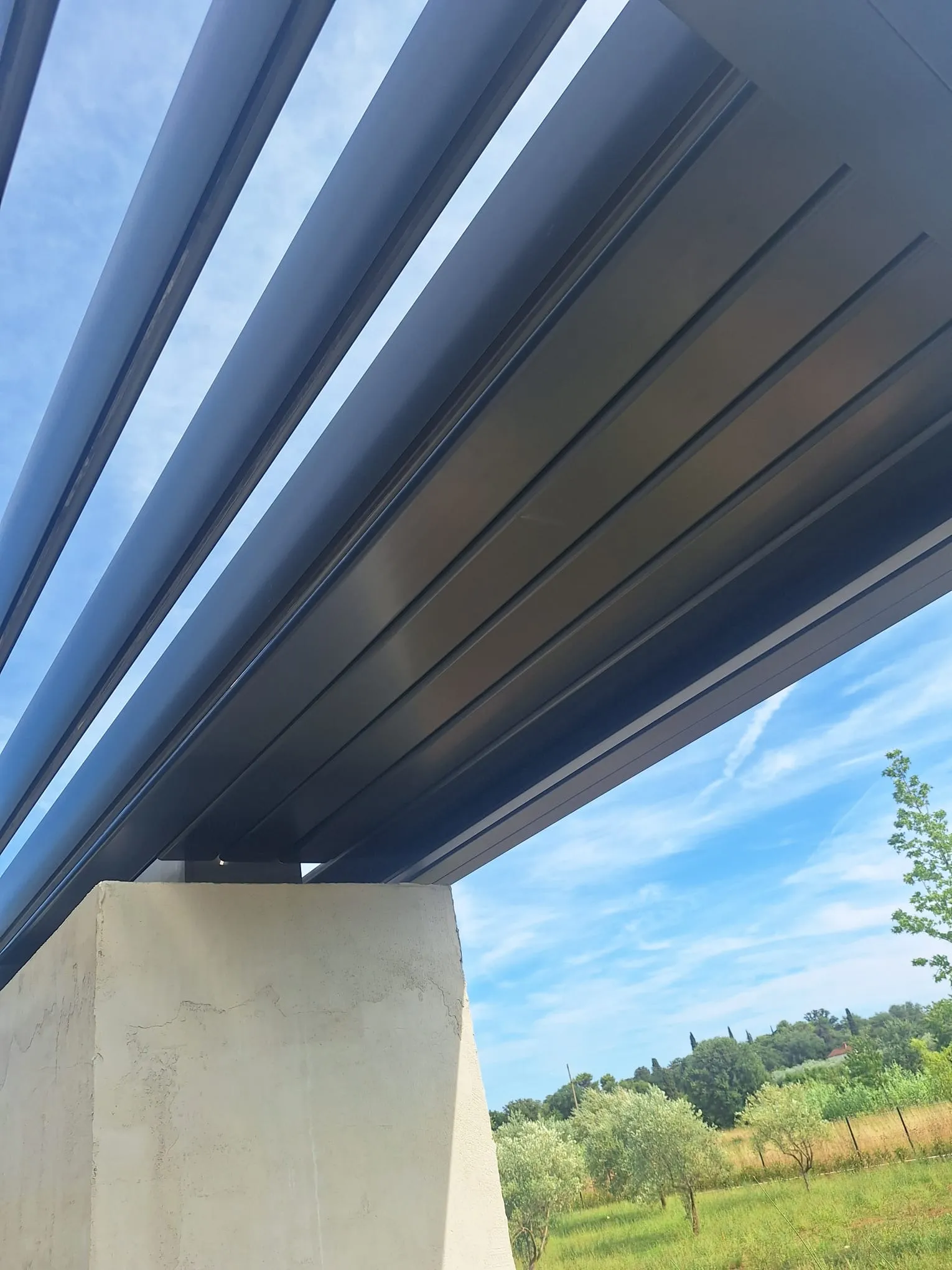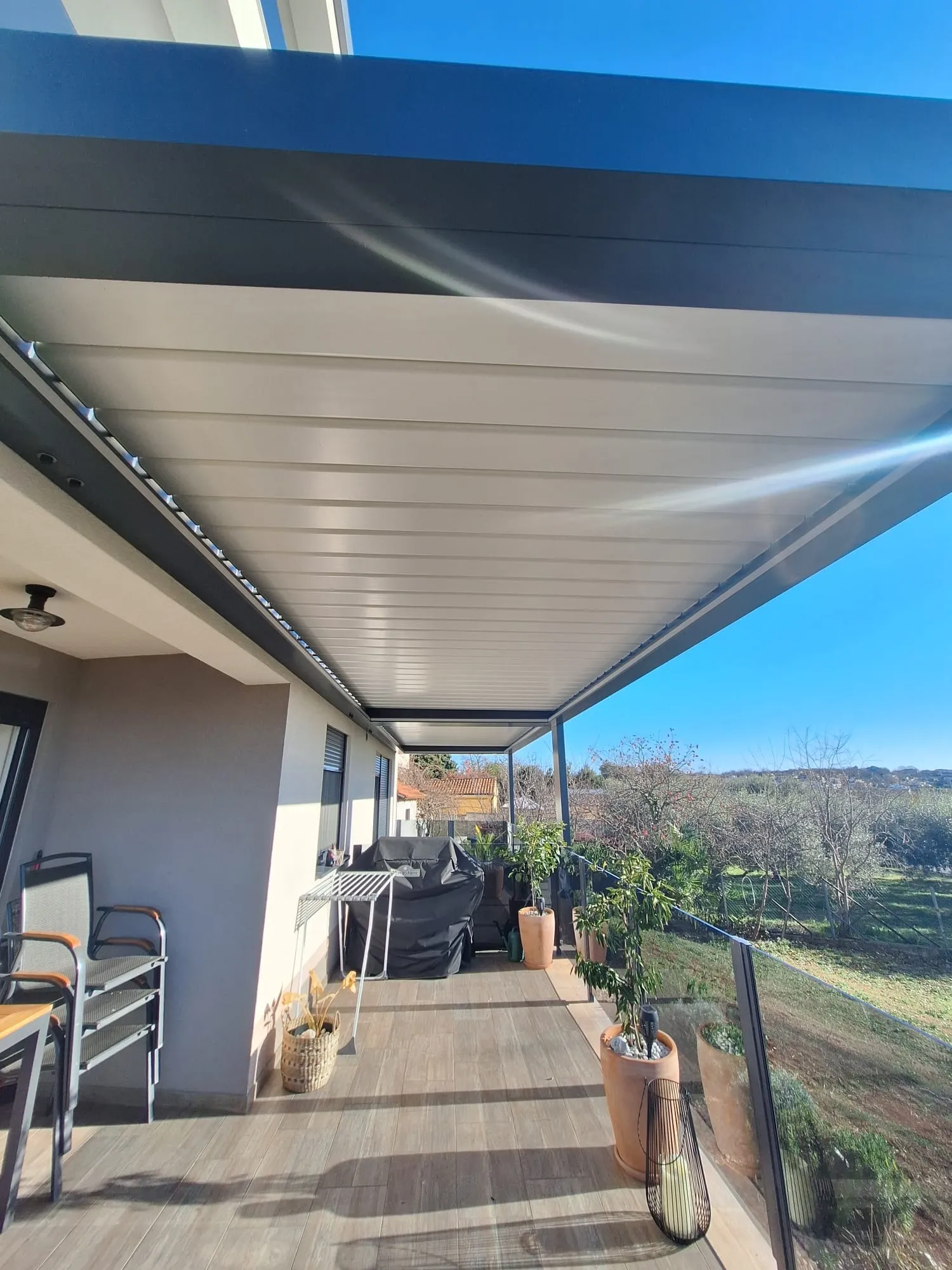 Potpuna vodootpornost: U zatvorenom položaju, lamele čine čvrst krov koji ne propušta kišu, uz integrirani sustav odvodnje vode kroz stupove.
